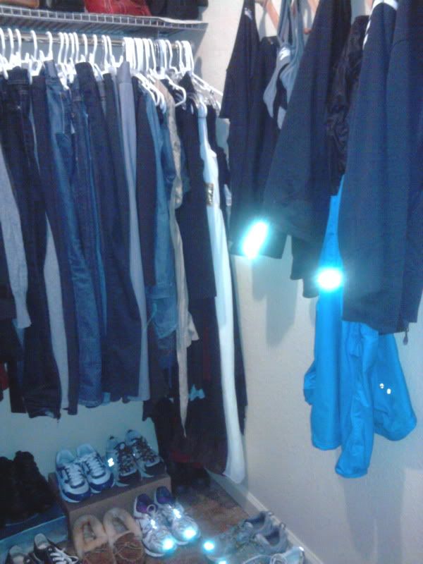 Funny how it's still crazy full of clothes after all I'm getting rid of. At least they're not all jam packed in anymore. I like how the reflective stuff on my running gear glows. Makes me feel safer.