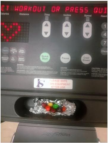 So I felt a bit foolish as I opened the foil packet and put it on the treadmill for easy access. Hehe, here I was surrounded by folks trying to lose weight and I put m&m's in front of me to eat as I run.